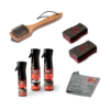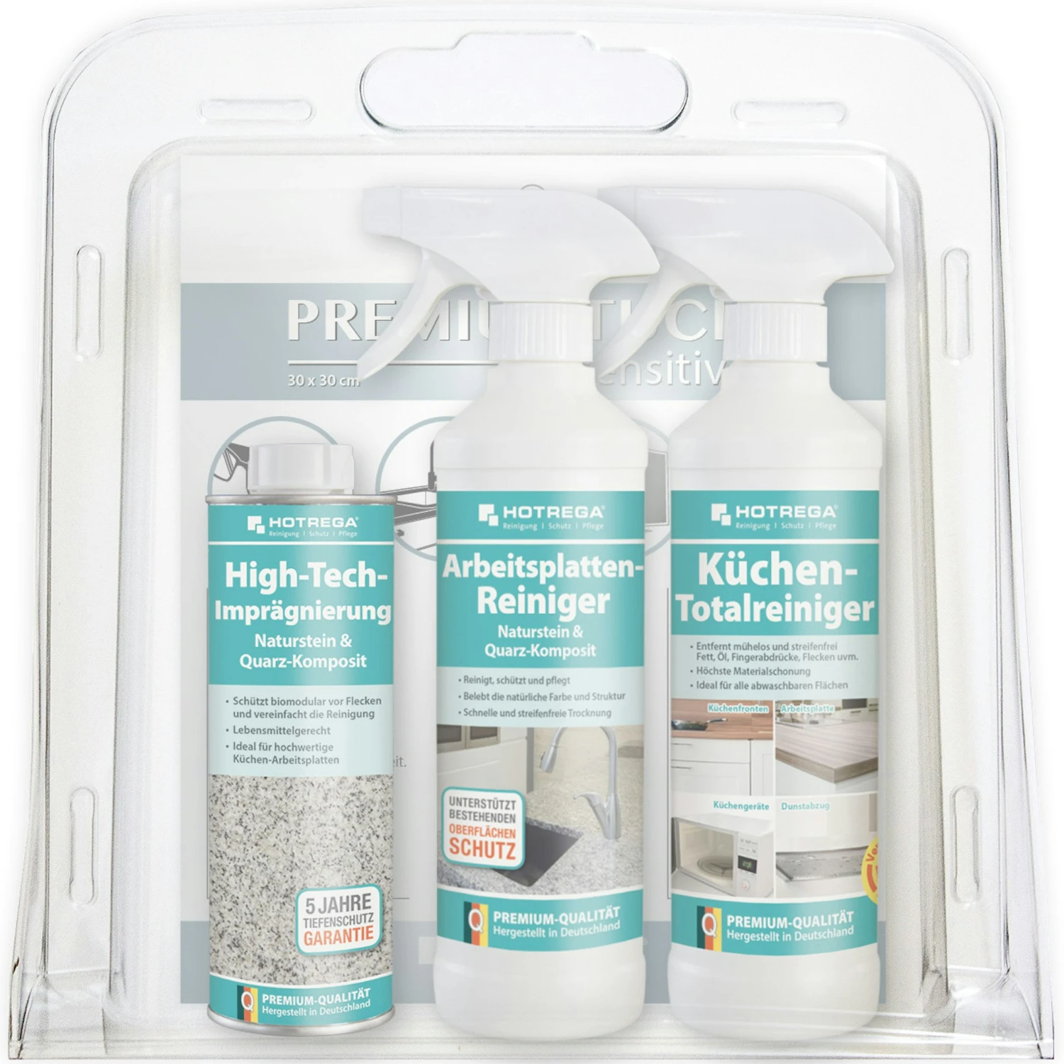 Praktisches Set für Steinarbeitsplatte, bestehend aus Edelstahl-Pflegespray Brillant, Backofen- und Grillreiniger, Glaskeramik-Kochfeld-Reiniger, Küchen-Fettlöser, High-Tech-Imprägnierung, Arbeitsplatten-Reiniger, 2x Premiumtuch sensitive, sowie einer Pflegeempfehlung